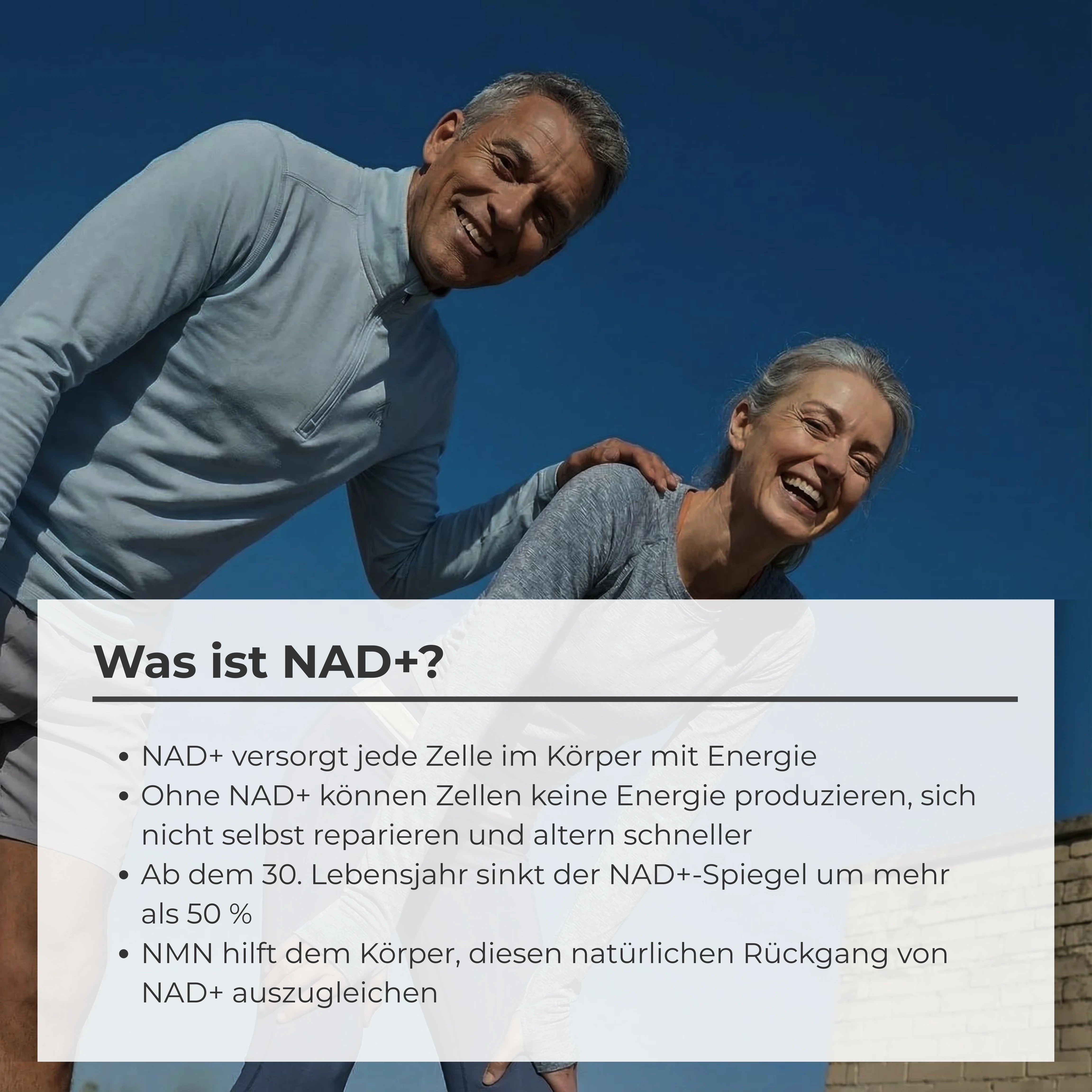 Was ist NMN? NMN (Nicotinamid-Mononukleotid) ist ein natürlich vorkommendes Molekül, ein sogenanntes Nukleotid, das den Körper mit Energie versorgt. NMN spielt viele Rollen: Es hilft bei der DNA-Reparatur, verspricht die NAD-Reparatur, kurbelt den Stoffwechsel an, produziert Energie und vieles mehr. NMN ist der Baustein unserer DNA, hilft bei der DNA-Reparatur, fördert den NAD-Spiegel, kurbelt den Stoffwechsel an, produziert Energie und vieles mehr. Entdecke mehr über die Wirkung von NMN in unserem Blog.