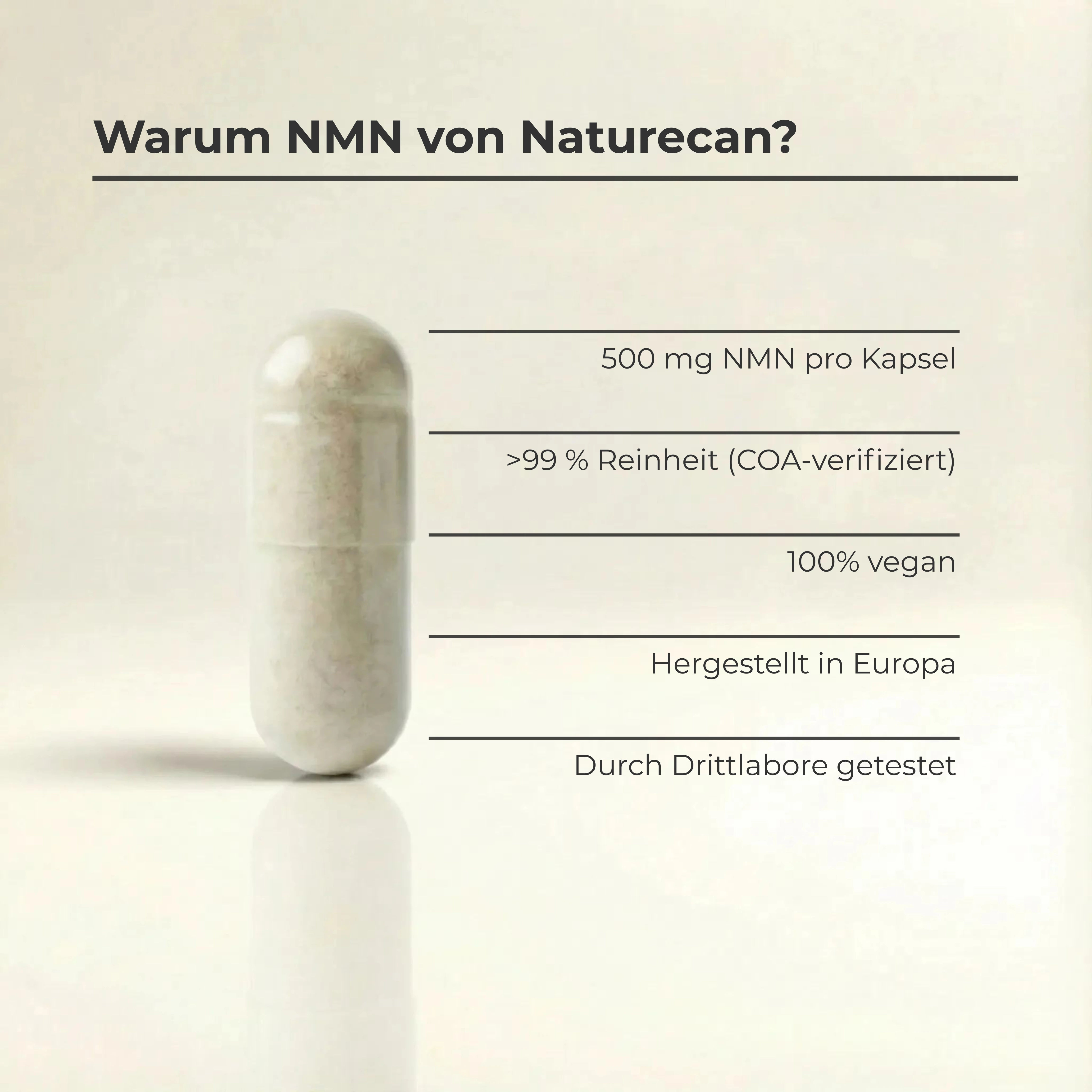 Das NMN-Supplement von Naturecan wurde von Ernährungsexpertinnen und -experten entwickelt, um eine hohe Bioverfügbarkeit, Stabilität und Reinheit sicherzustellen. In enger Zusammenarbeit mit Fachleuten aus der Branche wird kontinuierlich daran gearbeitet, neueste Erkenntnisse aus der Langlebigkeitsforschung und der Ernährungswissenschaft zu integrieren.