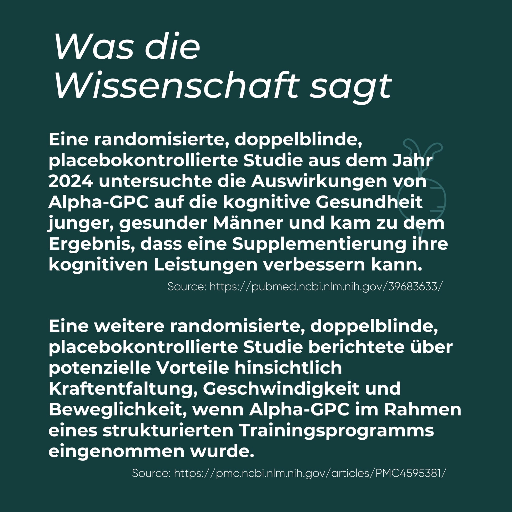 - Kognitive Gesundheit: Eine Studie aus dem Jahr 2024 zeigte, dass Alpha GPC bei gesunden Männern Marker der mentalen Leistungsfähigkeit positiv beeinflussen kann (PubMed ID: 39683633).