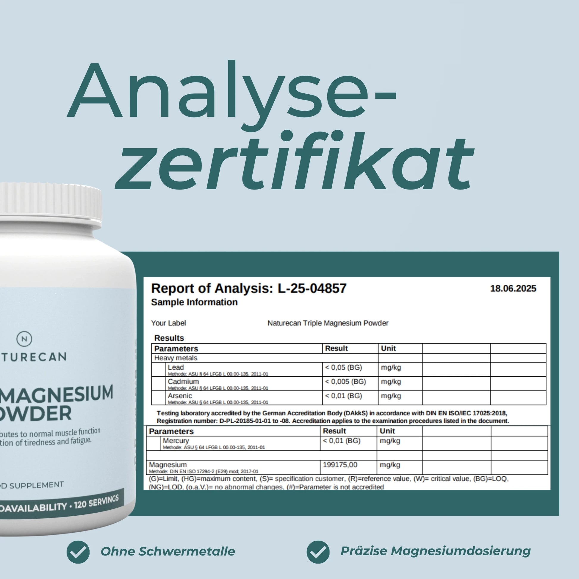 Jede Charge wird auf Reinheit und Wirkstoffgehalt geprüft, um dir ein sauberes und wirksames Nahrungsergänzungsmittel zu garantieren. Frei von künstlichen Zusatzstoffen, gentechnikfrei und 100 % vegan – Naturecan Magnesium erfüllt höchste Qualitätsstandards.