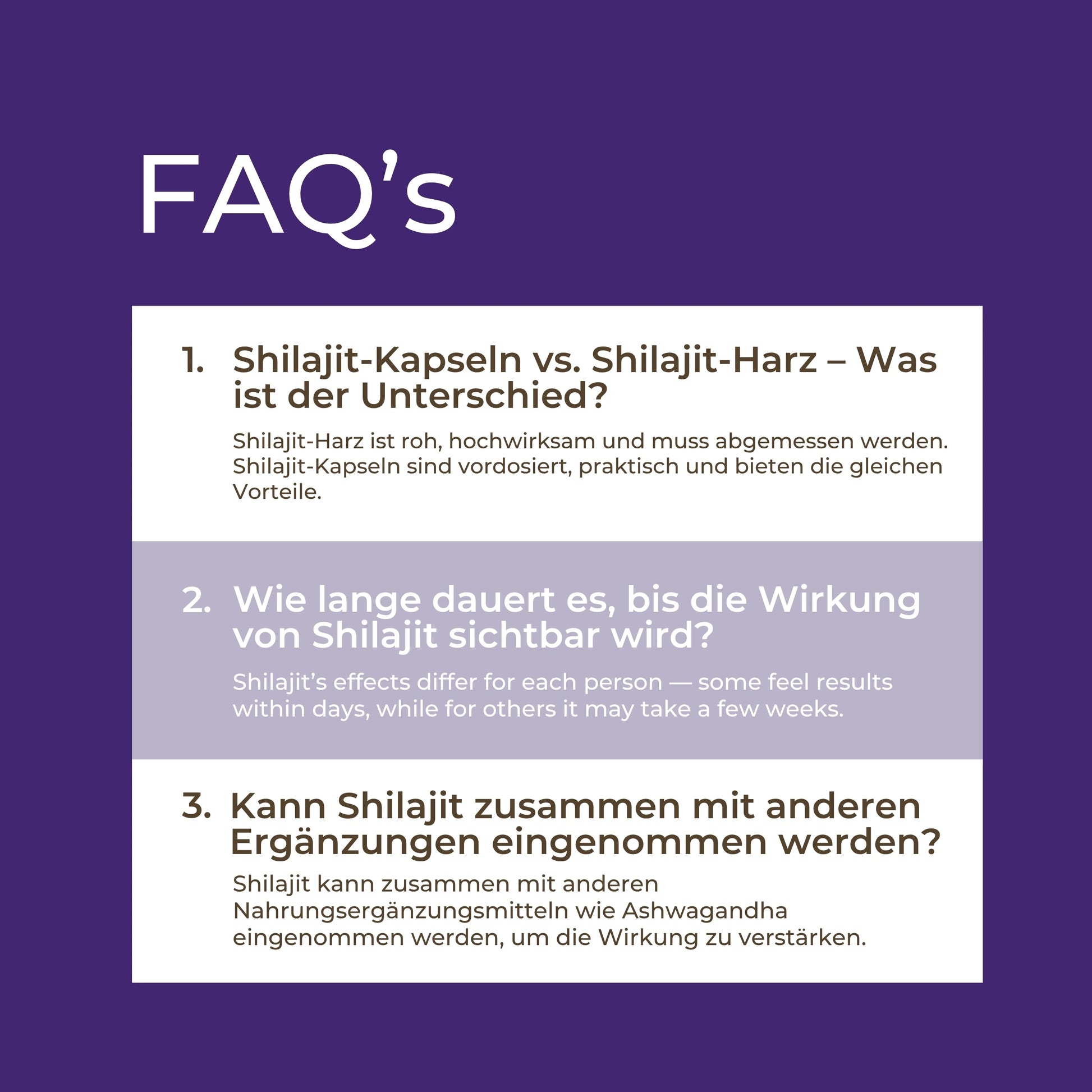 Dank der praktischen Kapsel-Form kannst du Shilajit einfach in deine tägliche Routine integrieren – ohne den starken, erdigen Geschmack von Shilajit-Harz.